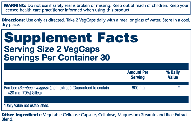 Bamboo contains an abundance of silica-- an important component in the production of collagen. Supplementing with Bamboo Stem Extract may help support the production of collagen and, thus, healthier connective tissue, hair, skin, nails, and bones. Solaray Bamboo Extract is standardized for organic silica and is guaranteed to contain 70% Silica.