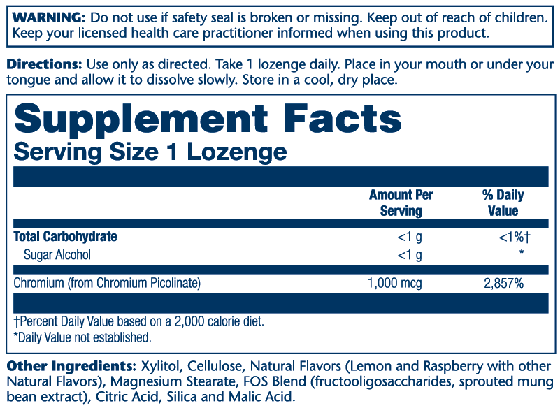 Chromium (from Chromium Picolinate), Xylitol, Cellulose, Natural Flavors (Lemon and Raspberry with other Natural Flavors), Magnesium Stearate, FOS Blend (fructooligosaccharides, sprouted mung bean extract), Citric Acid, Silica and Malic Acid.