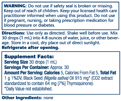 Black Seed (Nigella sativa) Oil 915 mg* (CO2 extract standardized to contain 64 mg [7%] Thymoquinone).