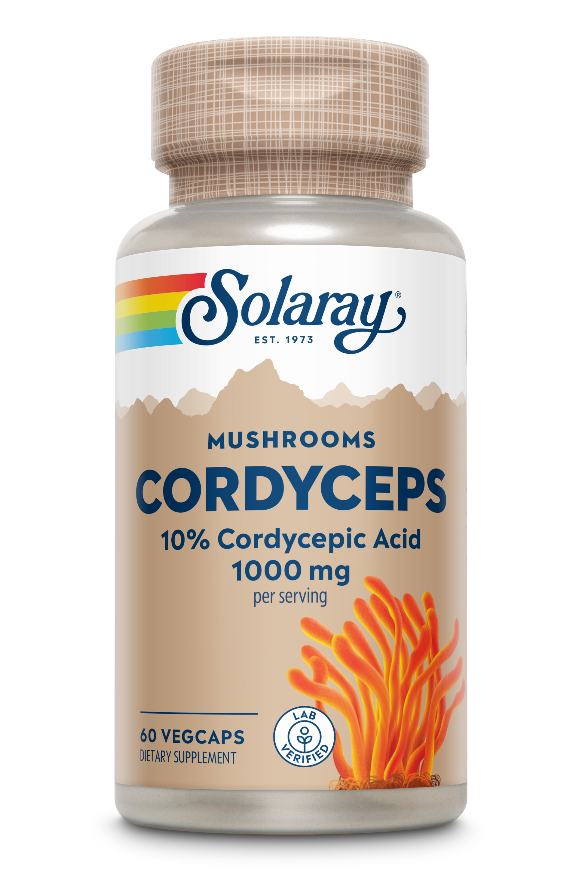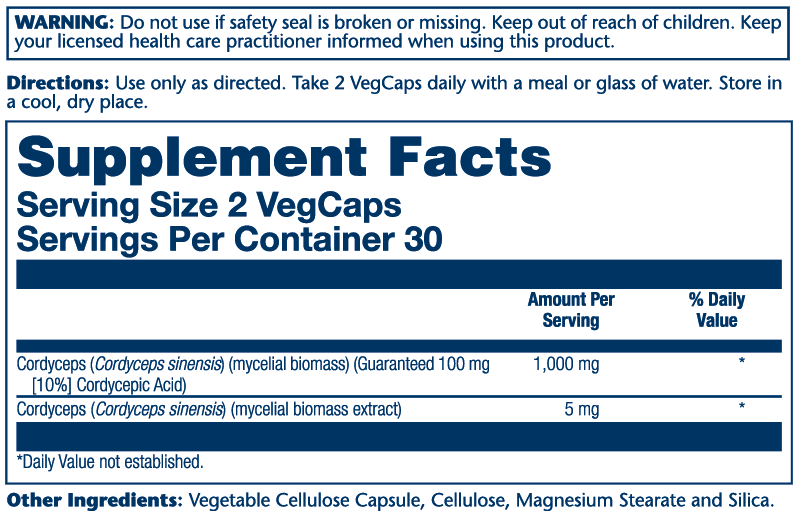 Cordyceps (Cordyceps sinensis) (mycelial biomass) (Guaranteed 100 mg [10%] Cordycepic Acid), Cordyceps (Cordyceps sinensis) (mycelial biomass extract), Vegetable Cellulose Capsule, Cellulose, Magnesium Stearate and Silica.