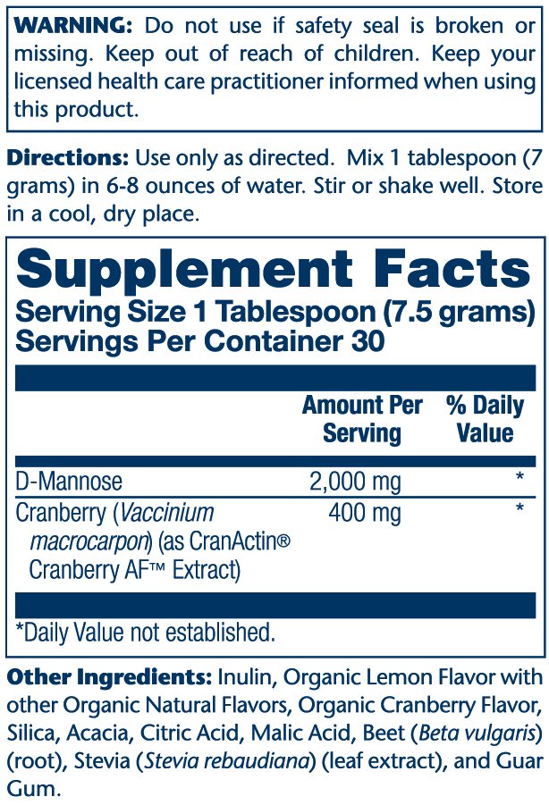 D-Mannose, Cranberry (Vaccinium macrocarpon) (as CranActin@ Cranberry AF™ Extract), Ingredients: Inulin, Organic Lemon Flavor with other Organic Natural Flavors, Organic Cranberry Flavor, Organic Berry Flavor, Silica, Acacia, Citric Acid, Malic Acid, Magnesium Hydroxide, Beet (Beta vulgaris) (root), Stevia (Stevia rebaudiana) (leaf extract), and Guar Gum.