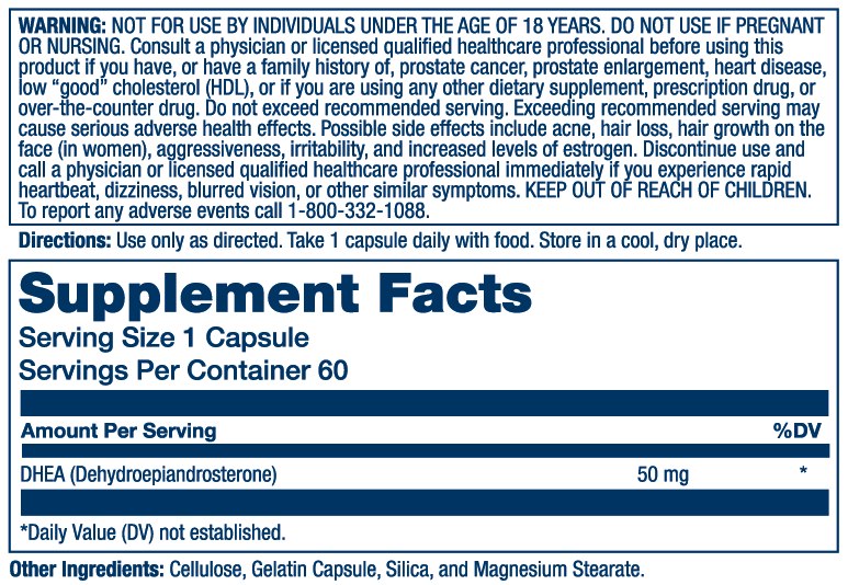 DHEA (Dehydroepiandrosterone), Cellulose, Gelatin Capsule, Silica, and Magnesium Stearate