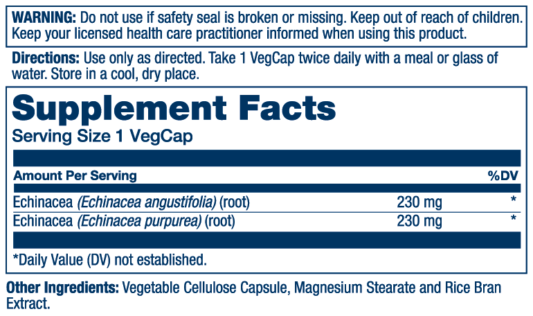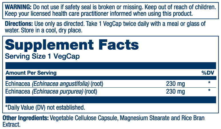 Echinacea (Echinacea angustifolia) root, Echinacea (Echinacea purpurea) root, Vegetable Cellulose Capsule and Rice Bran Extract.