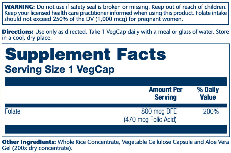 Folate (470 mcg Folic Acid), Whole Rice Concentrate, Vegetable Cellulose Capsule and Aloe Vera Gel (200x dry concentrate).