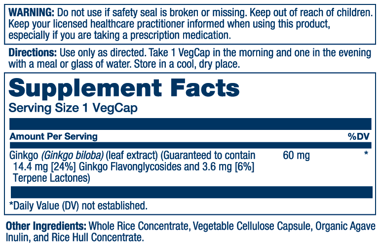 Ginkgo (Ginkgo biloba) (leaf extract) (Guaranteed to contain 14.4 mg [24%] Ginkgo Flavonglycosides and 3.6 mg [6%] Terpene Lactones, Whole Rice Concentrate, Vegetable Cellulose Capsule, Organic Agave Inulin and Rice Hull Concentrate.