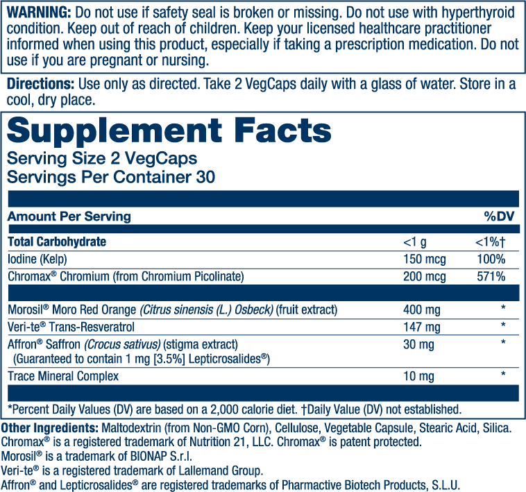 Morosil(R) Moro Red Orange, Veri-te(R) Trans-Resveratrol, affron(R) Saffron, Iodine (Kelp), Chromax(R) Chromium, Trace Mineral Complex