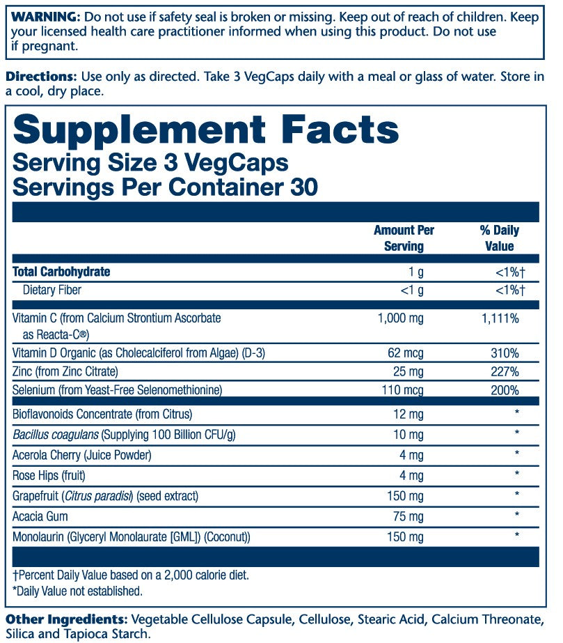 Vitamin C (from Calcium Strontium Ascorbate as Reacta-C®), Vitamin D Organic as Ch olecalcifero from Algae) (D-3), Zinc (from Zinc Citrate), Selenium (from Yeast-Free Selenomethionine), Bioflavonoids Concentrate (from Citrus), Bacillus coagulans (Supplying 100 Billion CFU/g), Acerola Cherry (Juice Powder), Rose Hips (fruit), Granefruit (Citrus naradish (seed extract!), Acacia Gum, Monolaurin (Glyceryl Monolaurate [GML]) (Coconut), Vegetable Cellulose Capsule, Cellulose, Steric Acid, Calcium Threonate, Silica and Tapioca Starch.