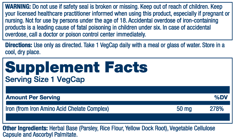 Iron (from Iron Amino Acid Chelate Complex), Herbal Base (Parsley Leaf, Rice Flour, Yellow Dock Root), Vegetable Cellulose Capsule and Ascorbyl Palmitate.