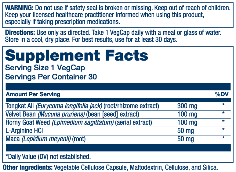 The recommended dosage of this expert-formulated supplement is 2 VegCaps daily, delivering 300 mg tongkat ali extract, 500 mg yohimbe bark extract, 50 mg L-Arginine HCI, plus velvet bean, horny goat weed and maca root in each serving.