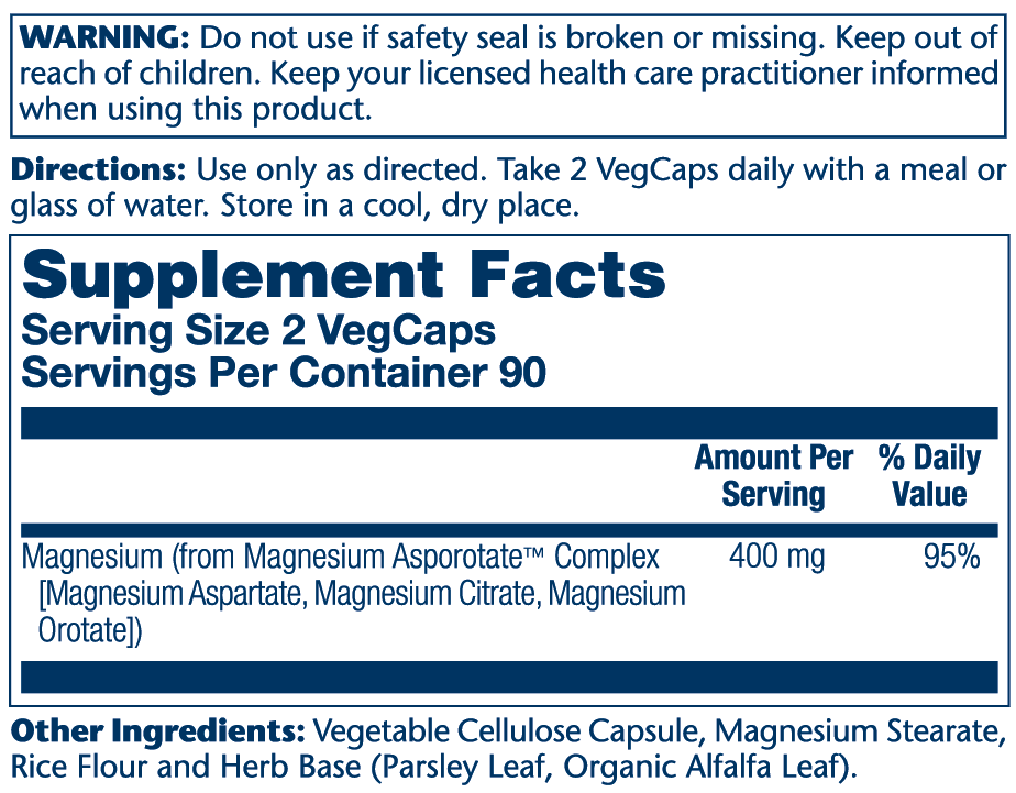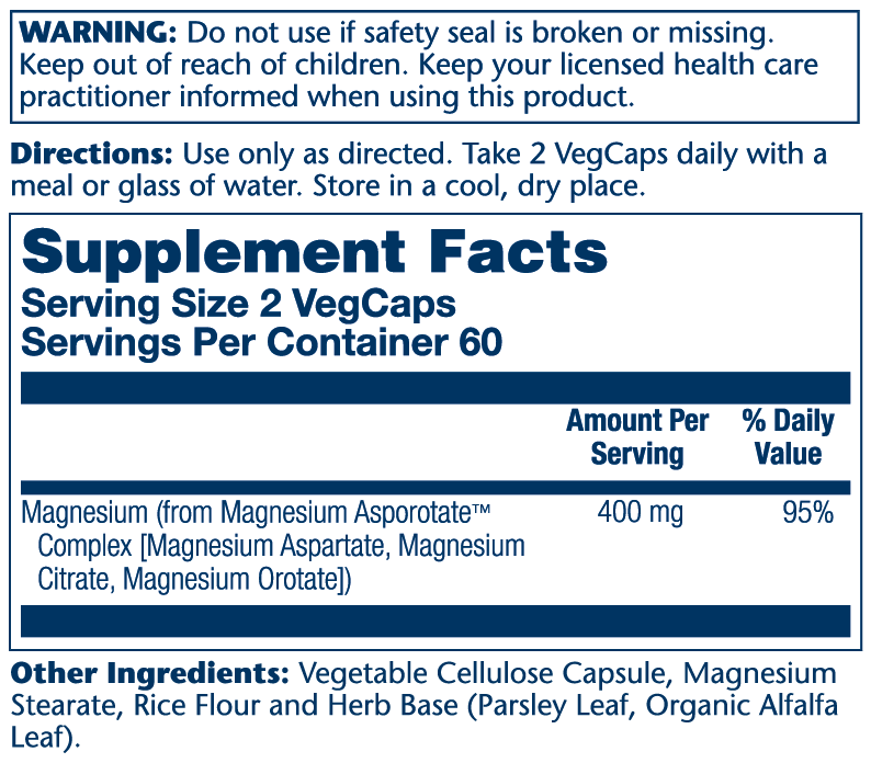 Magnesium (from Magnesium Asporotate Complex [Magnesium Aspartate, Magnesium Citrate, Magnesium Orotate]), Vegetable Cellulose Capsule, Magnesium Stearate, Rice Flour and Herb Base (Parsley Leaf, Organic Alfalfa Leaf), Magnesium Asporotate™ is formulated to support strong bones and muscle support.*