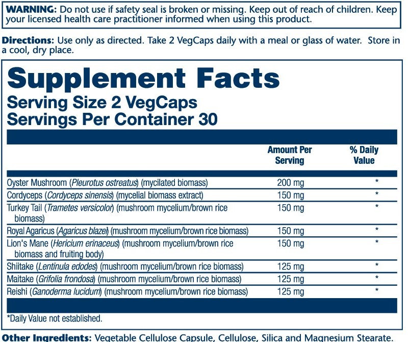 Ovster Mushroom (Pleurotus ostreatus\ (mycilated biomass), Cordvceos (Cordvceps sinensis) (mcelial biomass extract), Turkey Tail (Trametes versicolor) (mushroom mycelium/brown rice biomass), Royal Agaricus (Agaricus blaze) (mushroom mycelium/brown rice biomass), Lion's Mane (Hericium erinaceus) (mushroom mycelium/brown rice biomass and fruiting body), Shitake (Lentinula edodes) (mushroom mycelium/brown rice biomass), Maitake (Grifolia frondosa) (mushroom mycelium/brown rice biomass), Reishi (Ganoderma lucidum) (mushroom mycelium/brown rice biomass)