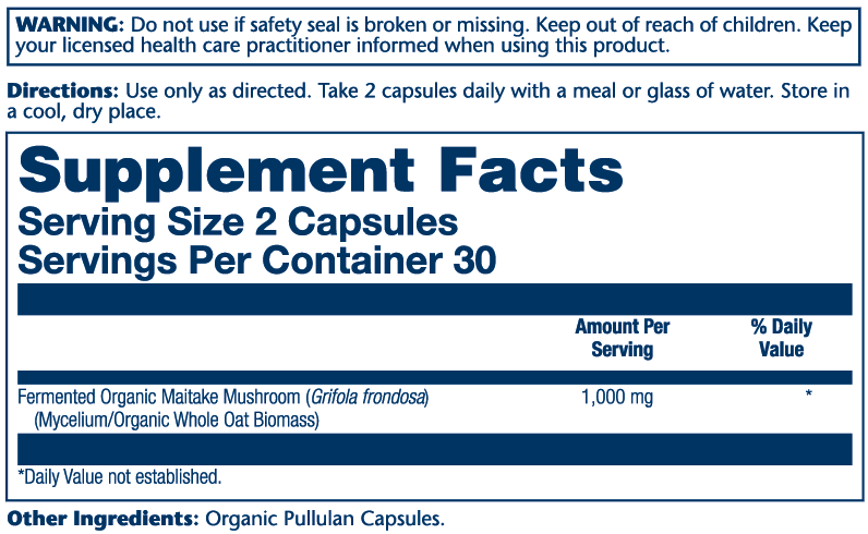 Fermented Organic Maitake Mushroom (Grifola frondosa) (Mycelium/Organic Whole Oat Biomass), Organic Pullulan Capsules.