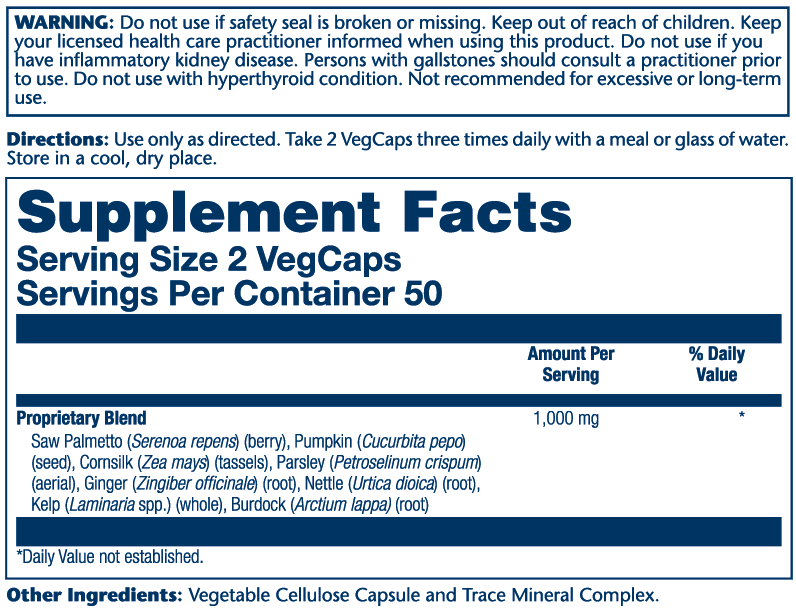 Proprietary Blend - Saw Palmetto (Serenoa repens) (berry), Pumpkin (Cucurbita pepo) (seed), Cornsilk (Zea mays) (tassels), Parsley (Petroselinum crispum) (aerial), Ginger (Zingiber officinale) (root), Nettle (Urtica dioica) (root), Kelp (Laminaria spp.) (whole), Burdock (Arctium lappa) (root), Vegetable Cellulose Capsule and Trace Mineral Complex.