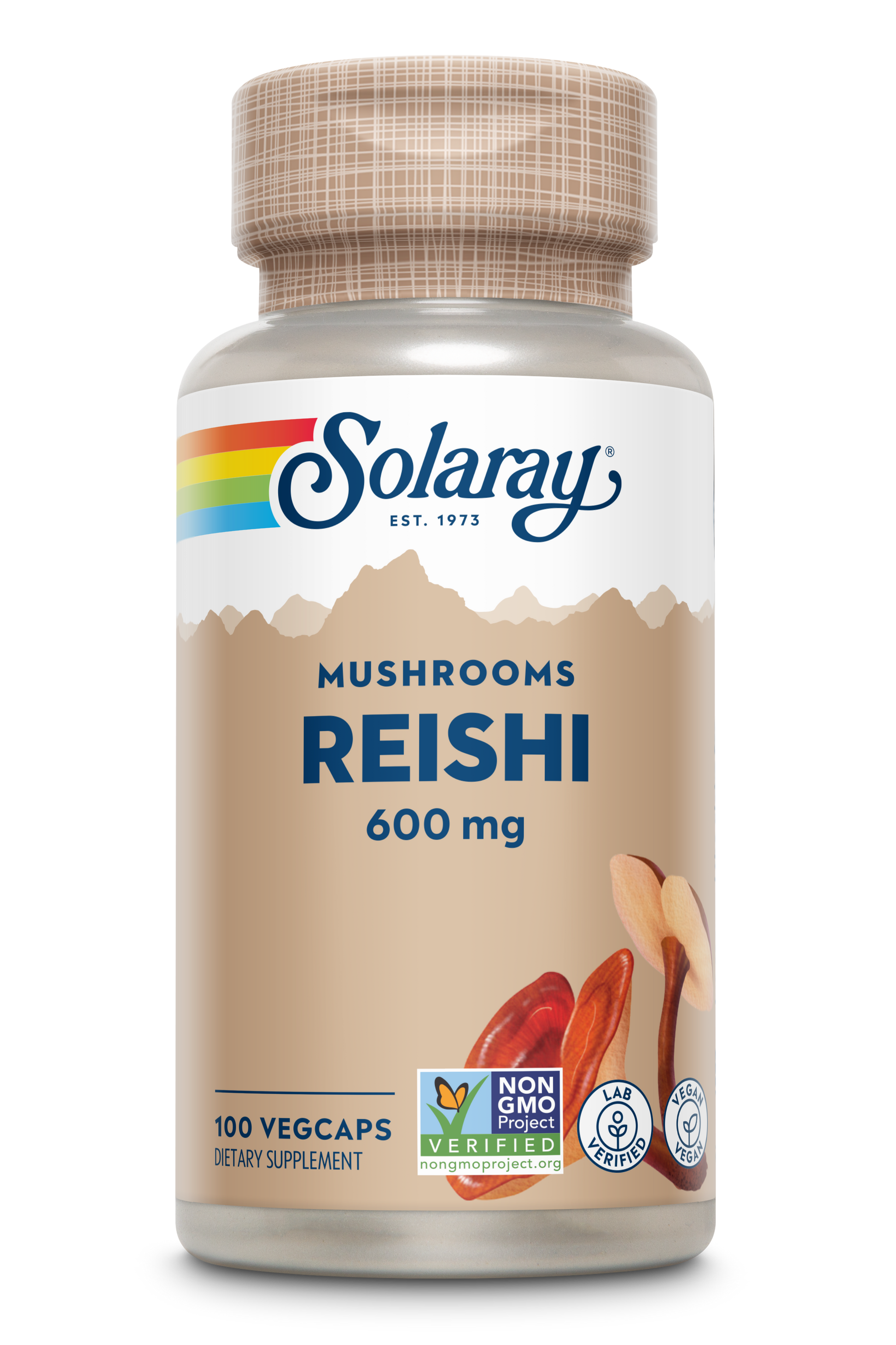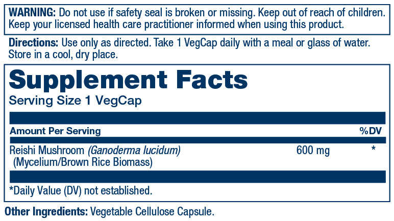 Reishi Mushroom (Ganoderma lucidum) (Mycelium/Brown Rice Biomass), Vegetable Cellulose Capsule.