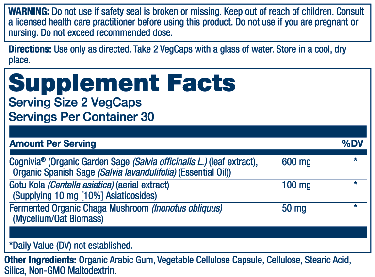 Cognivia(R) Organic Garden Sage (Salvia officinalis L.) (Leaf extract), Organic Spanish Sage (Salvia lavandulifolia)(Essential Oil), Gotu Kola (Centella asiatica) (Aerial extract)(supplying 10 mg [10% Asiaticosides]), Fermented Organic Chaga Mushroom (Inonotus obliquus)(Mycelium/Oat Biomass), Organic Arabic Gum, Vegetable Cellulose Capsule, Cellulose, Stearic Acid, Silica, non-GMO Maltodextrin