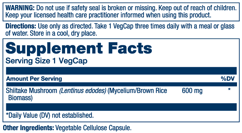 Shiitake Mushroom (Lentinus edodes) (Mycelium/Brown Rice Biomass), Vegetable Cellulose Capsule.