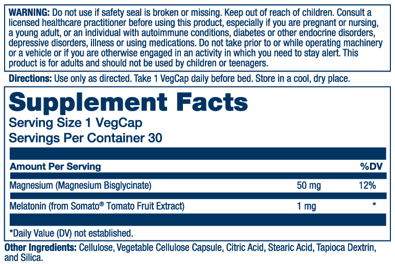 Magnesium (Magnesium Bisglycinate), Melatonin (from Somato® Tomato Fruit Extract), Cellulose, Vegetable Cellulose Capsule, Citric Acid, Stearic Acid,Tapioca Dextrin, and Silica