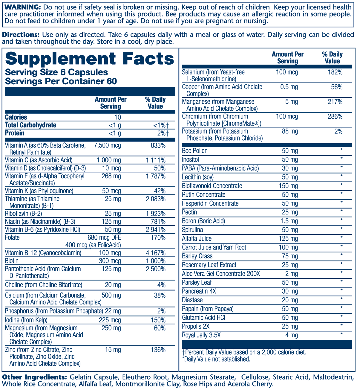 Vitamin A, Vitamin C, Vitamin D, Vitamin E, Vitamin K, Thaimine, Riboflavin, Niacin, Vitamin B-6, Folate, Vitamin B-12, Biotin, Pantothenic Acid, Calcium, Phosphurus, Iodine, Magnesium, Zinc, Selenium, Copper, Magnese, Chromium, Potassium, Choline, Bee Pollen, Insoitiol, PABA, Lecthinin, Bioflavanoid, Rutin, Hesperidin Concentrate, Pectin, Boron, Spirulina, Alfalfa, Carrot Juice and Yam, Barley Grass, Rosemary Leaf Extract, Aloe Vera, Parsley Leaf, Pancreatin 4X, Diatase, Papain, Glutamic Acid HCl, Propolis 2X, Royal Jelly 3.5X, Gelatin Capsule, Eleuthero Root, Magnesium Stearate, Cellulose, Stearic Acid, Maltodextrin, Whole Rice Concentrate, Alfalfa Leaf, Montmorillonite Clay, Rose Hips and Acerola Cherry.