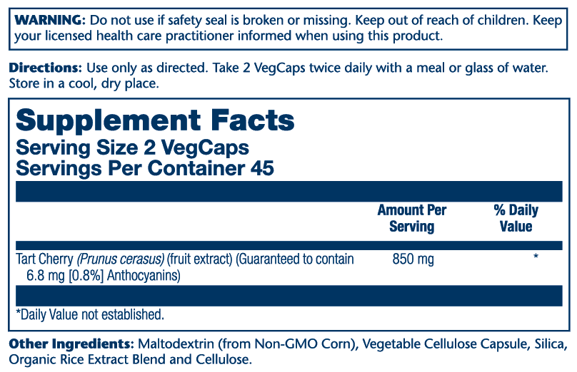 Solaray Tart Cherry Fruit Extract brings you the benefits of tart cherry juice‚ a popular joint health drink, without the sugar. Along with at least 17 antioxidants including quercetin, anthocyanins, and ellagic acid, tart cherries contain an abundance of nutrients as well as trace melatonin. Designed to help support your body's natural cleansing process of uric acid, our Tart Cherry Fruit Extract is guaranteed to contain .8% anthocyanins and may help support healthy joints and muscle recovery as well as normal, healthy sleep cycles.