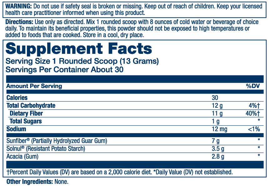 7g SunFiber® Partially Hydrolyzed Guar Gum, 3.5g Solnul® Resistant Starch, 2.8g Acacia Gum, Other Ingredients: None