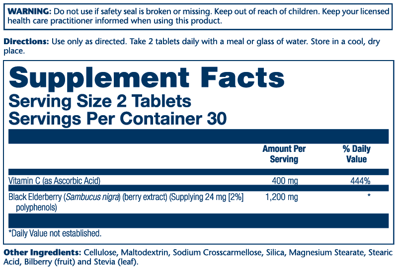 Vitamin C (as Ascorbic Acid), Black Elderberry (Sambucus nigra) (berry extract) (Supplying 24 mg [2%] polyphenols), Cellulose, Maltodextrin, Sodium Crosscarmellose, Silica, Magnesium Stearate, Stearic Acid, Bilberry (fruit) and Stevia (leaf).