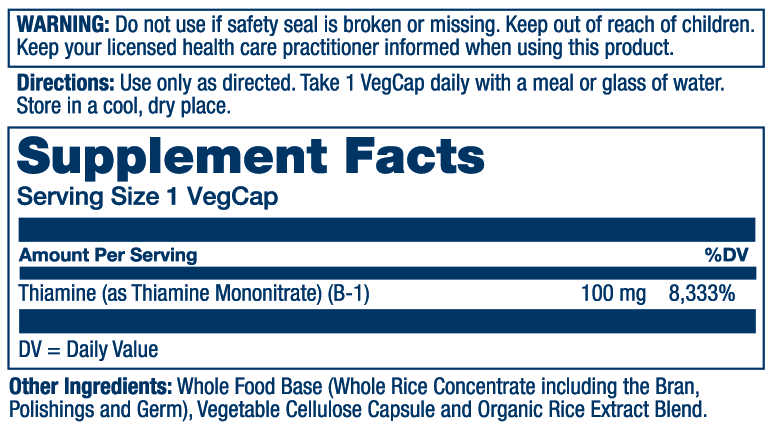 Thiamine (as Thiamine Mononitrate) (B-1), Whole Food Base (Whole Rice Concentrate including the Bran, Polishings and Germ, and Aloe Vera Gel), Vegetable Cellulose Capsule and Organic Rice Extract Blend.