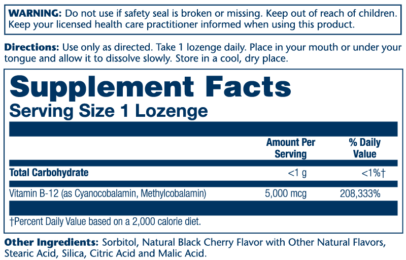 Vitamin B-12 (as Cvanocobalamin, Methylcobalamin), Sorbitol, Natural Black Cherry Flavor with Other Natural Flavors, Stearic Acid, Silica, Citric Acid and Malic Acid.