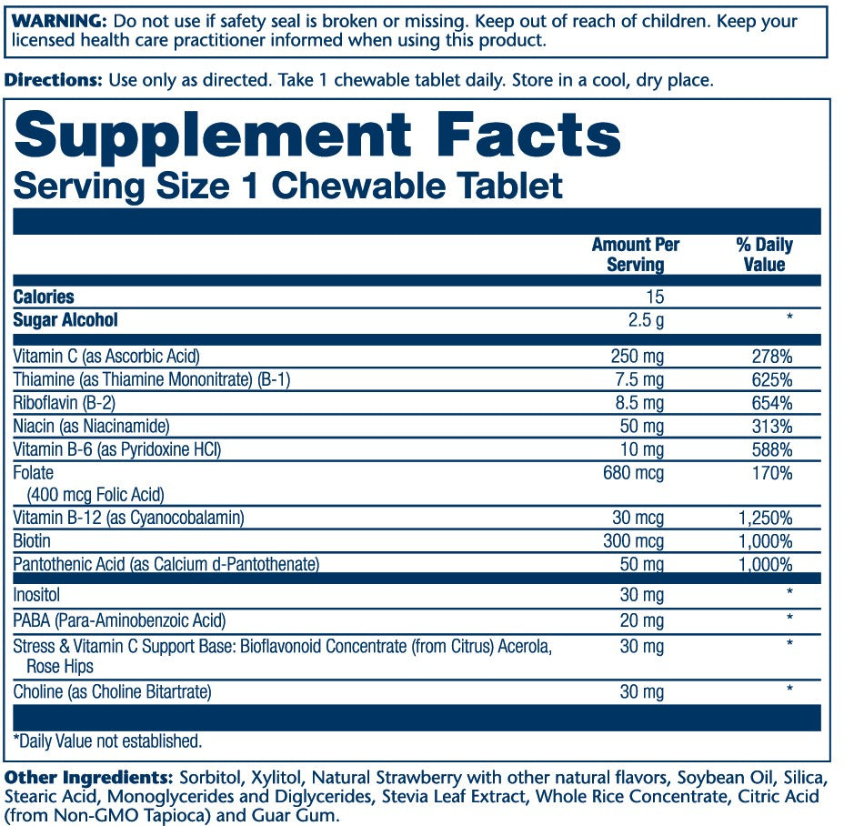 Vitamin C, Thiamine, Riboflavin, Niacin, Vitamin B-6, Folate, Vitamin B-12, Biotin, Pantothenic Acid, Inositol, PABA, Stress & Vitamin C Support Base: Bioflavanoid Concentrate Acerola, Rose Hips, Choline, Sorbitol, Xylitol, Natural Strawberry with other natural flavors, Soybean Oil, Silica, Stearic Acid, Monoglycerides and Diglycerides, Stevia Leaf Extract, Whole Rice Concentrate, Citric Acid (from Non-GMO Tapioca) and Guar Gum.