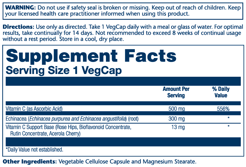 Vitamin C (as Ascorbic Acid Echinacea (Echinacea purpurea and Echinacea angustifolia) (root), Vitamin C Support Base (Rose Hips, Bioflavonoid Concentrate, Rutin Concentrate. Acerola Cherry), Vegetable Cellulose Capsule and Magnesium Stearate.