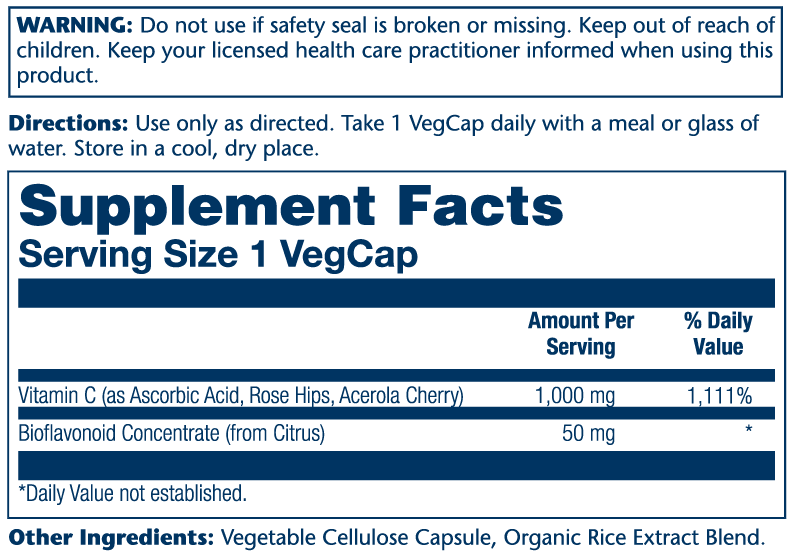 Vitamin C (as Ascorbic Acid. Rose Hips. Acerola Cherry), Bioflavonoid Concentrate (from Citrus), Vegetable Cellulose Capsule, Organic Rice Extract Blend.
