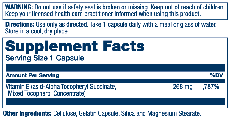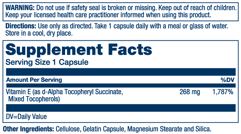 Vitamin E (as Natural d-Alpha Tocopheryl Succinate, Unesterified Mixed Tocopherols)(Supplying 400 IU of Vitamin E), Cellulose, Gelatin Capsule, Silica and Magnesium Stearate.