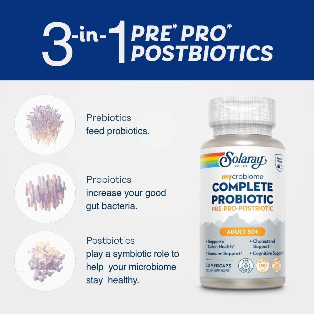 †30% off discount valid on all Mycrobiome Complete formulas on Solaray.com. Discount not applicable on repeating subscription orders. Use code COMPLETE. Offer valid until 9/30/25 at 11:59 p.m. MST. Offer may be modified or terminated at any time. Exclusions apply.